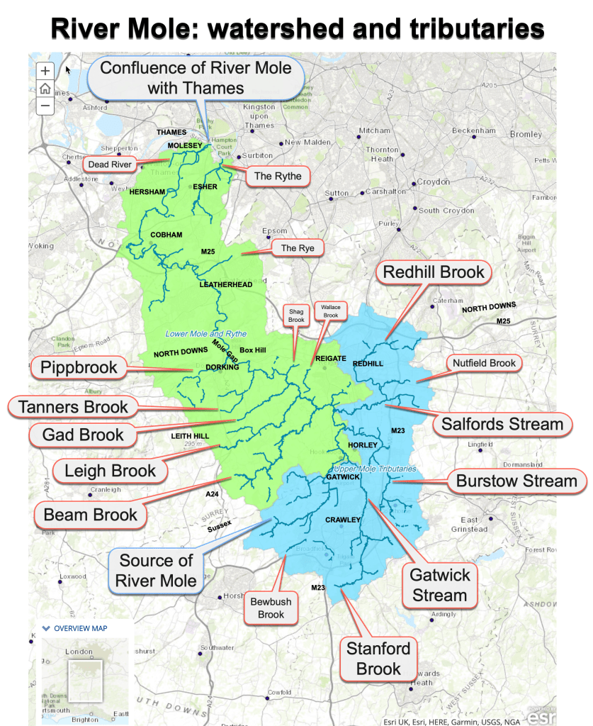 Numerous other tributaries spring from higher ground and more remote places on the watershed. Pippbrook rises from over 200m in a valley on the eastern shoulder of Leith Hill; Stanford Brook, which becomes Gatwick Stream, emerges from remote hills in Worth Forest south of Crawley, while Burstow Stream has tributaries rising from land in the far-flung south east of the catchment around Tulleys Farm near Crawley Down. There are no tributaries through the Mole Gap and only a few north of it including The Rye, rising from Ashtead Common, a bourne rising in Bookham which I think is called the Earbourne and the aptly named “Dead River” (a sluggish ditch) which flows into the Lower Mole just before the confluence with the River Thames at Hampton Court.