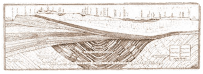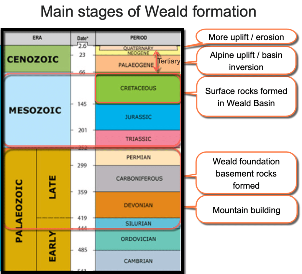 We can think of the formation of a landscape something like building a house. The foundations are first to go in. For the Weald this would be the oldest rock foundations laid down between 300 and 400 million years ago in the Palaeozoic. These rocks would become what geologists call the “basement” or Palaeozoic Floor. They are now buried under several kilometres of more recent, younger, overlying rocks. Kent coal, for example, is found up to 3000 feet or 915m below the surface.