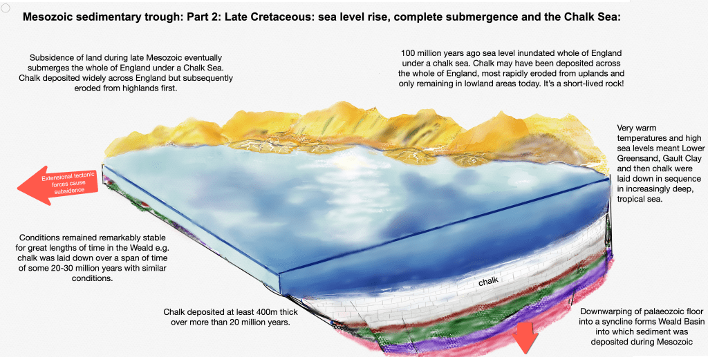 Part 2: The Mesozoic Trough: the 200 million year story of how the rocks beneath our feet were laid down in watery basins, mainly during the Cretaceous. The bands of sedimentary rocks around the Weald, from sandstones in the High Weald to Chalk on the Downs, were laid down during the Mesozoic. Changes in rock type mark the different environment where rocks were deposited..from muddy deltas where Iguanadon roamed, to deep tropical Chalk seas.