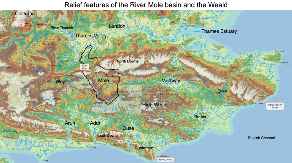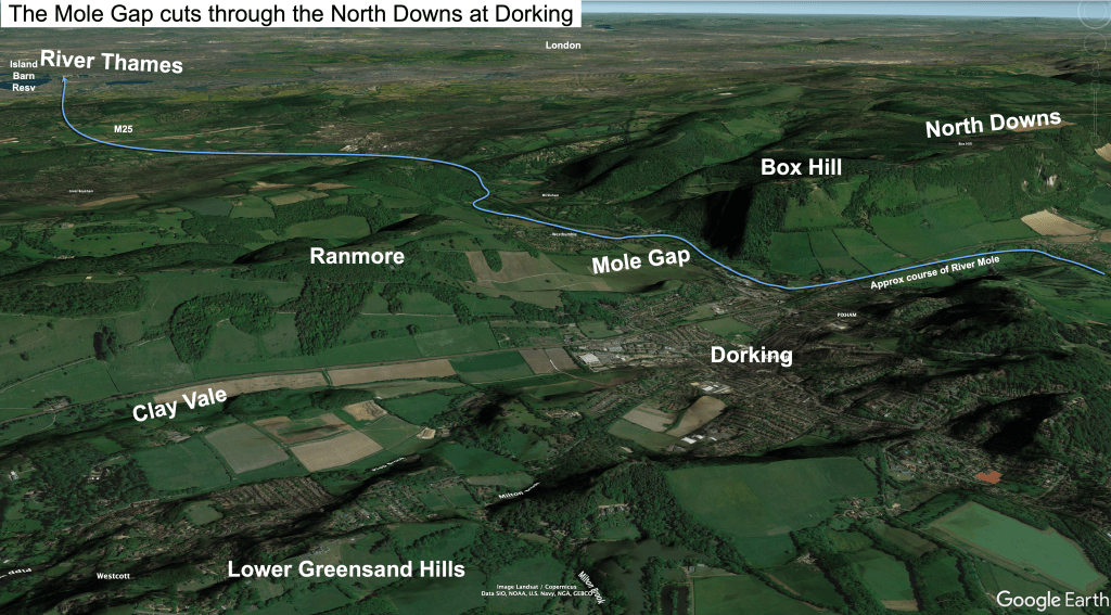 The Mole Gap is one such through-valley, there are at least eight other river gaps cutting through hills around the Weald, excluding numerous elevated dry “wind gaps” which no longer host a river.
