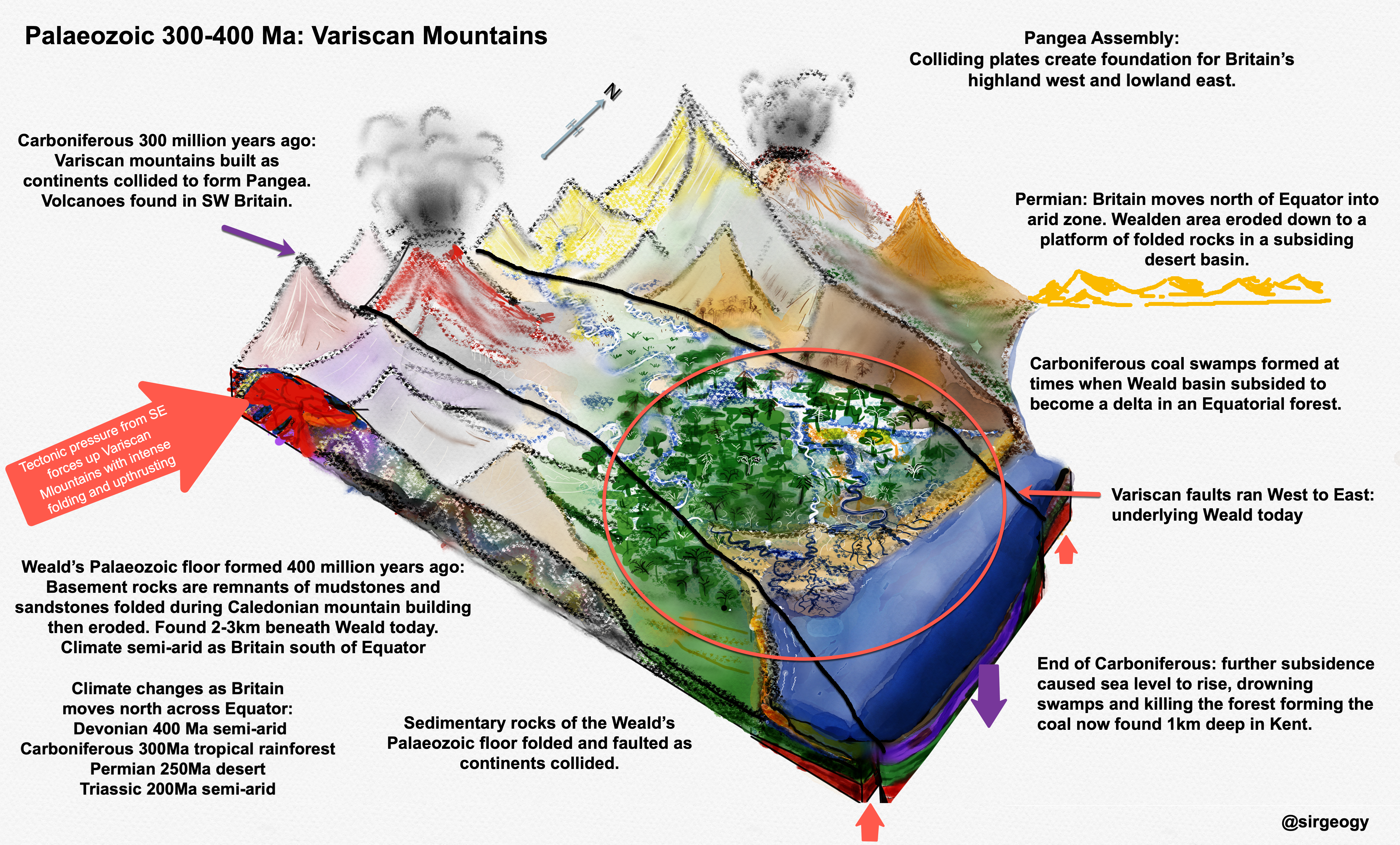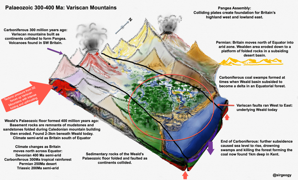 Part 1: The Palaeozoic Floor: the first part of the Weald story starts when our piece of the Earth’s crust, somewhere in the Southern Tropics, was on the edge of a fold mountain range called the Variscan Mountains which left faults crucial to how the Weald landscape formed 200 million years later. The very oldest rocks beneath the Weald are now buried kilometres beneath our feet and include the coal found in Kent, itself 3000 feet down. These oldest, deepest rocks form what geologists call the “Palaeozoic Floor” or basement.