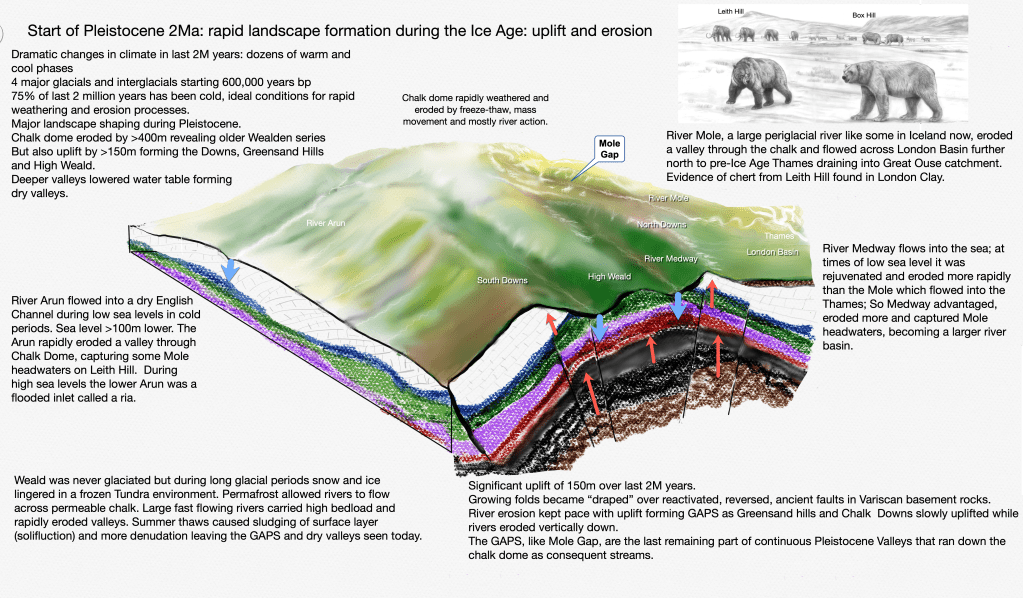 Part 4: Pleistocene Ice Age to now: The great fluctuations of climate in the last 2.6 million years have been responsible for rapid erosion and landscape change. For 80% of this time the Weald would have been a frozen, windswept Tundra. Brief periods of warmth caused permafrost to thaw, snow and ice to melt and torrential rivers to erode and transport debris into valleys. Warm interglacials and the spread of forests stalled landscape formation into a warm, sleepy state…which is where we are now.