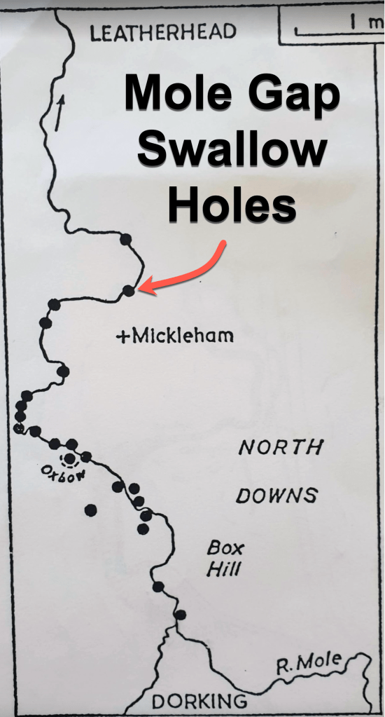 On the journey through the Mole Gap the River Mole famously passes over Chalk where some discharge is lost into the permeable rock through swallow holes. At times of very low flow due to prolonged dry weather, such as late Summer 2022, the River Mole can disappear underground into the chalk in the Mole Gap, reappearing at points of resurgence at Leatherhead, on located in Fetcham Pond, where the geology changes to impermeable clay.