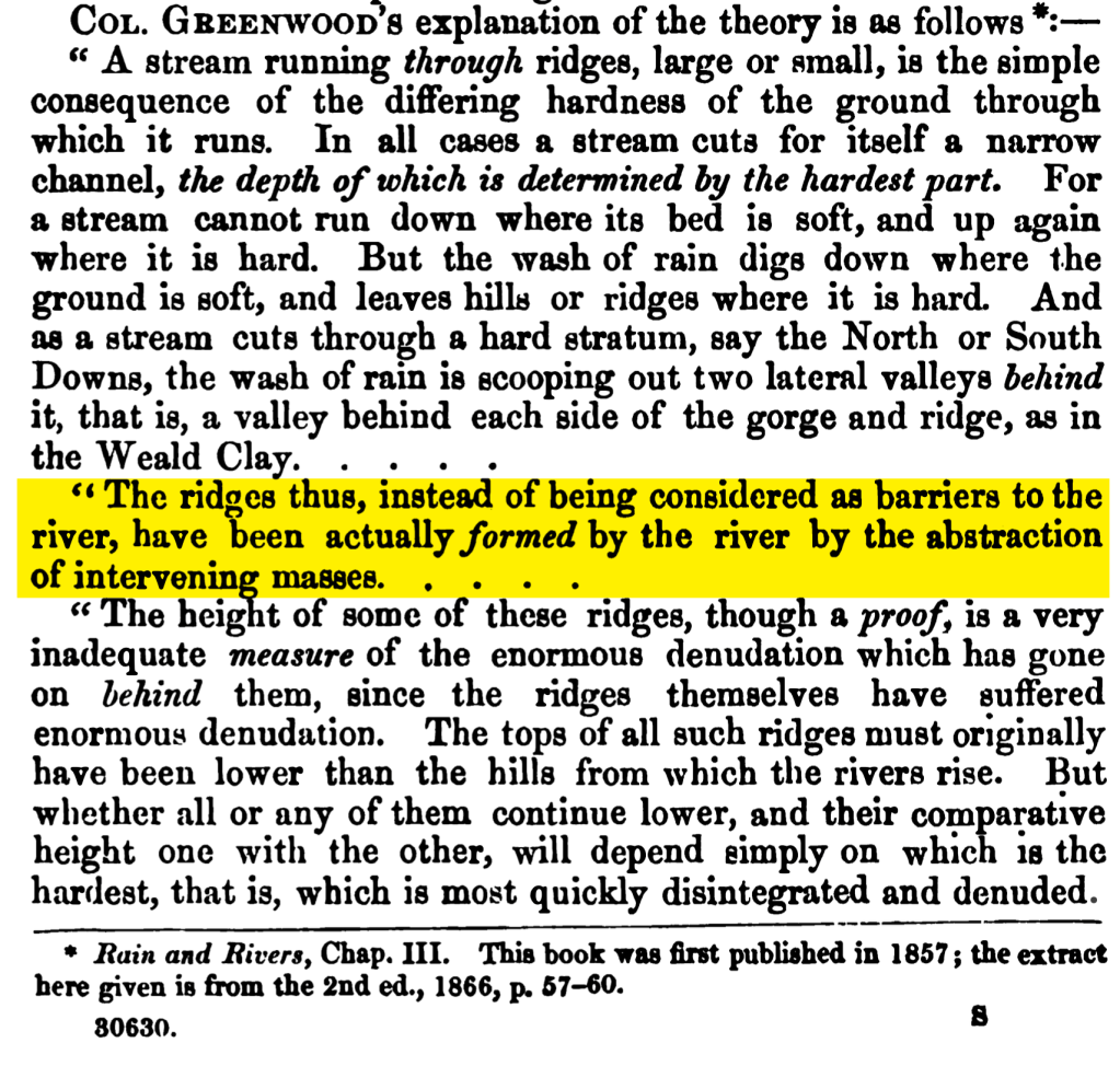 Here is another lovely explanation from the same book accounting for the apparent conundrum of rivers flowing through lines of more resistant hills via gaps like the Mole Gap.