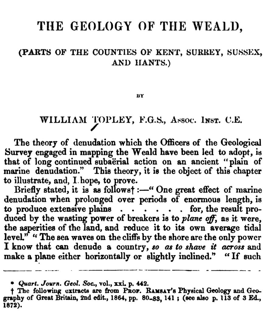 The marine-planation theory was a popular explanation of the Weald landscape in the 19th Century. It seemed to account for the apparent concordance of hill top height. The text below is from the 1874 account of “The Geology of the Weald” by W Topley. I have not come across anything that better describes the landscape from such a deep wealth of personal knowledge! The description of landscape formation is wonderful..