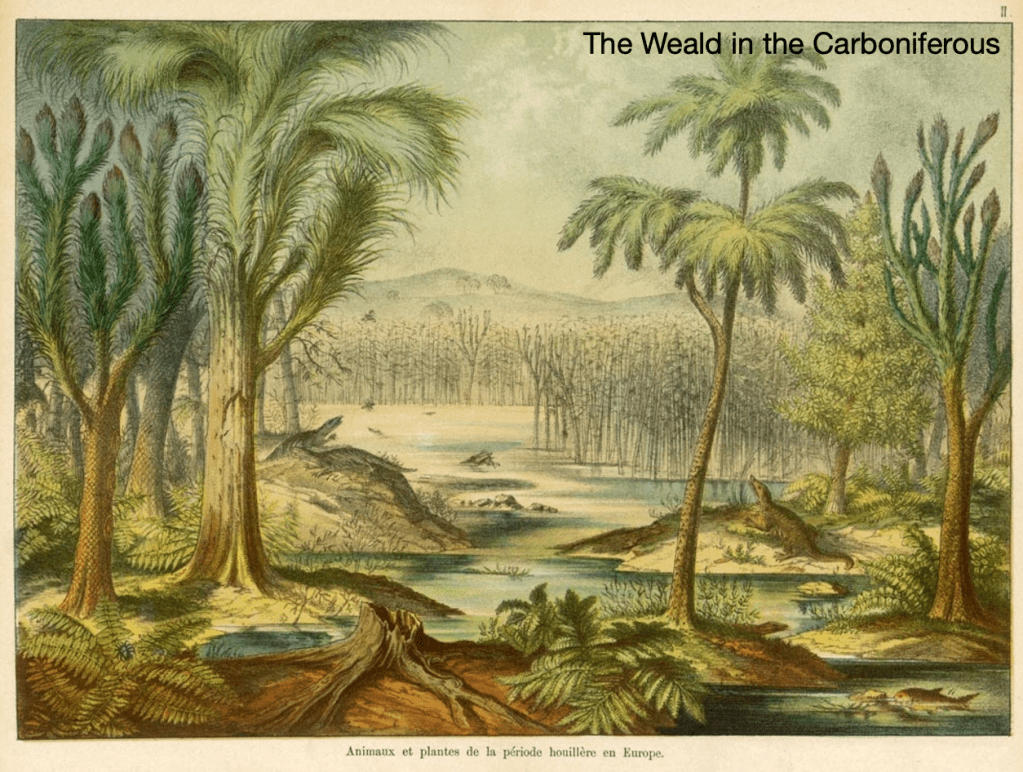 The Carboniferous, 299-359 million years ago, was a crucial time for the nascent Weald. Britain moved Equator-ward and the climate became increasingly hot and wet with the growth of swampy tropical forests. Higher temperatures caused sea levels to rise and forest swamps were slowly drowned. The drowning trees died, were buried and decayed in anaerobic conditions under more sediment and compressed into coal seams now found below Kent. The Carboniferous period saw the greatest sequestration of carbon from the atmosphere into the ground in Earth geological history. It took more than 10 million years to capture the carbon but humans have emitted much of it back into the atmosphere in less than 100 years!