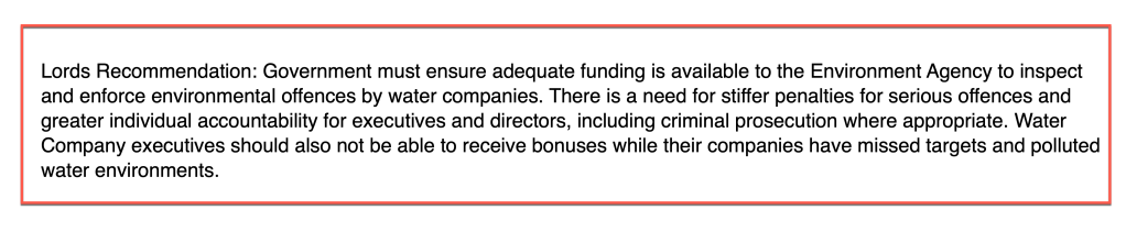 EA thousand Cuts! The Environment Agency’s funding has been cut which has seriously compromised monitoring and enforcement of breaches of permit. This led to an over-reliance on self-monitoring by water companies which is only now being addressed by private firms tasked with monitoring e.g Adler and Allen. EA penalties awarded to Water Companies for serious offences have also been insufficient to act as a robust deterrent. While penalties for companies and CEOs are now being addressed appropriately, in my opinion, prison sentences are an expensive and unnecessary trial for everyone and meanwhile, the pollution on the ground probably goes on.