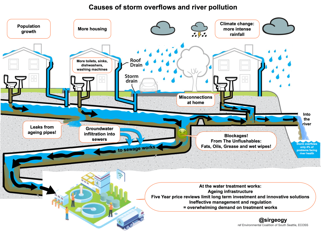 Storm overflows refer to untreated water being released into rivers from water treatment works (WWTW) or combined sewer overflows (CSOs) or pumping stations. The diagram below shows numerous causes or triggers of storm overflows but let’s look at how bad the situation is first.