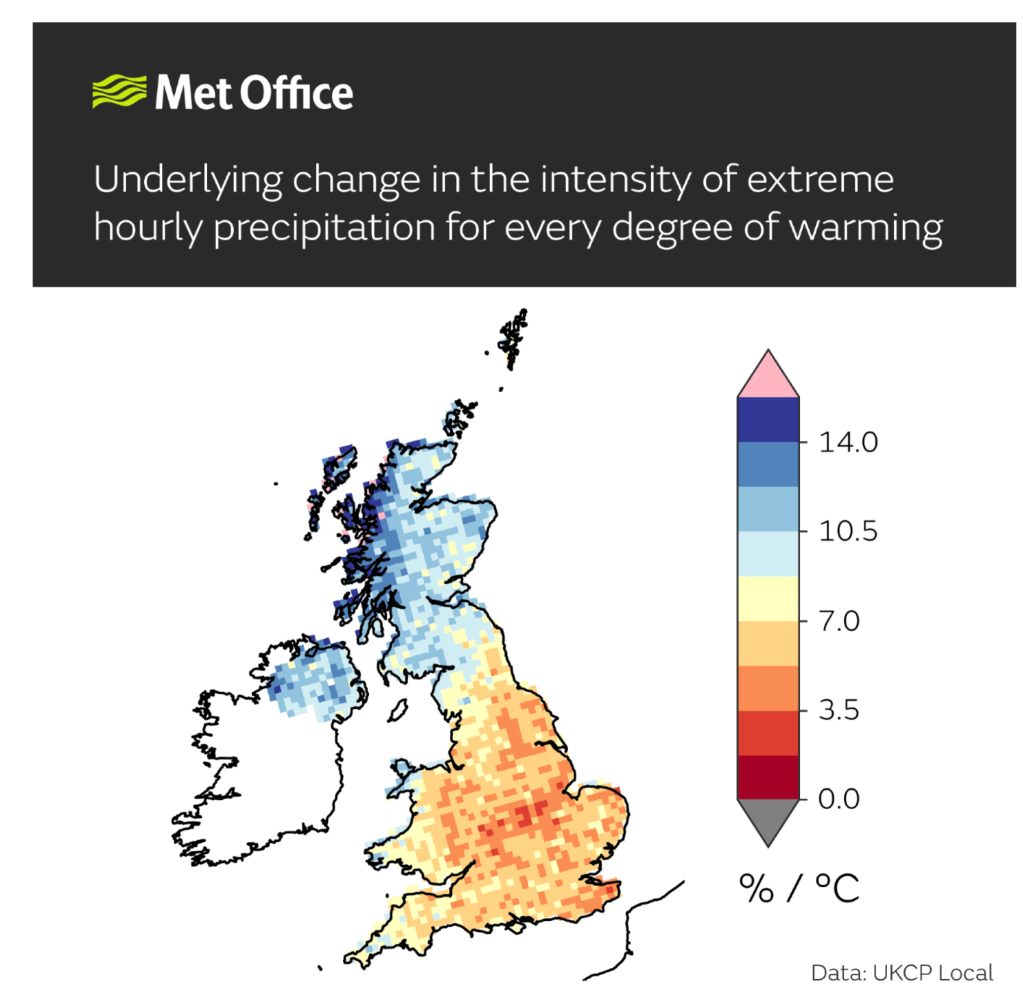 Climate change: A recent MetOffice study confirmed that rainfall is predicted to increase in intensity with every degree of warming.