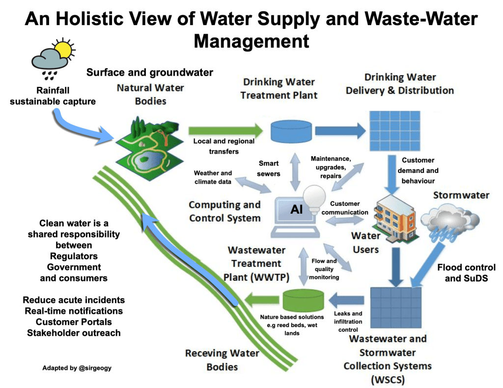 An holistic approach means connecting the start of the process, from weather and climate change drivers delivering variable amounts of rain, with the complex web of interacting systems and challenges such as climate change, water supply, biodiversity loss, agricultural productivity, flooding and human health and well being, all the way to the very end of the process, with clean waste discharging into rivers or the sea.