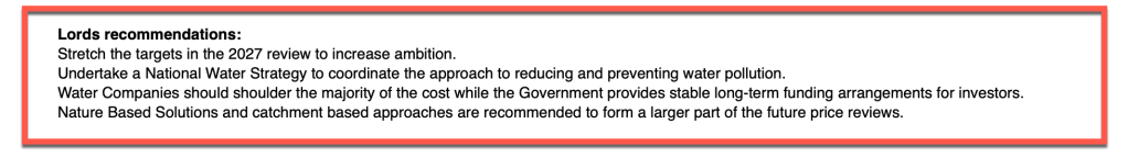 This is a summary of the Lords Committee report which includes additional data from water company plans and some observations of plans from my own catchment, the River Mole in Surrey, to complete a picture of where we seem to be going. Each specific Lords recommendation is shown inside a red box using the wording of the report. The whole post here is based on the report with numerous other sources. All references used are listed below.
