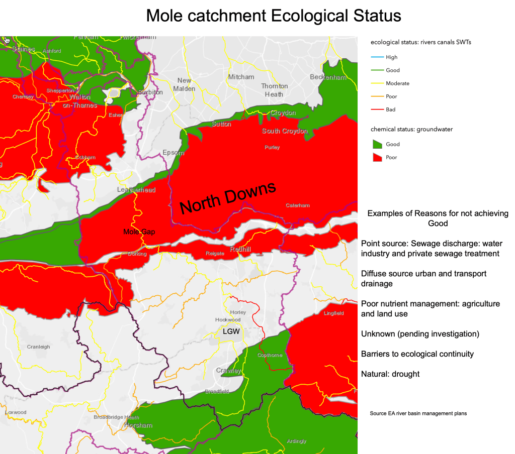 For example, the Mole catchment has been sliced up and the crucial southerly watershed appears to be part of the strategy for Reading and Berkshire.The Mole basin appears to have been sliced in half, not conducive to an holistic approach. By contrast, EA operate catchment officers are focussed on particular river basins. Achieving a joined up approach within catchments and to facilitate operating in conjunction with regulators is central to successfully tackling river basin problems… after all, rivers start a the source and finish at the end of the basin flowing through a myriad of habitats, towns, farms, treatment works and flood defences: all of these knock one onto the next. So it seems the 25 year plan for Surrey has missed a step towards an holistic approach joining up with regulators within at least one catchment.
