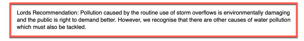 Unfortunately, pollution of rivers by the water industry as a whole forms just 36% of pollution in rivers. Furthermore, EA data suggests storm overflows are only 4% of the damage to river health. So, while tackling storm overflows is important, it will sadly not restore river health by itself. The Lords asked “is prioritising storm overflows best value for money?” Other measures mentioned so far, like changing consumer behaviour is an absolutely vital part of the whole picture to improve river health.