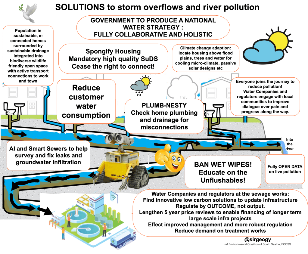 Into this picture must be added flood protection. Sustainable Urban Designs (SuDS or as Sarah Bentley CEO of Thames Water called it “spongifying” development!) and slowing the flow of runoff into rivers is crucial to include in a National Strategy, not least because a significant cause of pollution into rivers is rainfall causing uncontrolled runoff into drains overwhelming treatment works causing storm overflows.