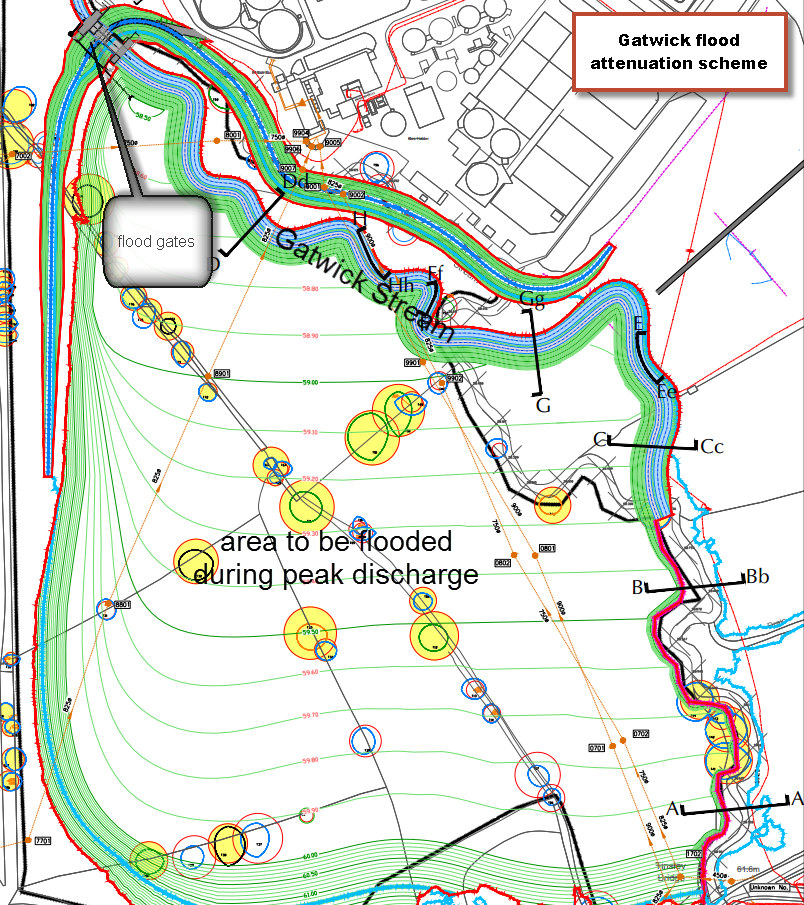 These alleviation schemes were designed to protect against a 1% annual exceedence probability (AEP), also known as the 1:100 year flood. However, climate change and development has probably lowered the flood protection to 1:75 year flood now. Whilst these are “hard engineering” schemes, some elements of flood management around Gatwick have enhanced biodiversity through improvements on the realigned sections including channel restoration along the Gatwick Stream.