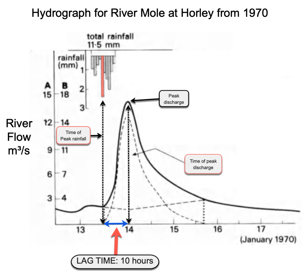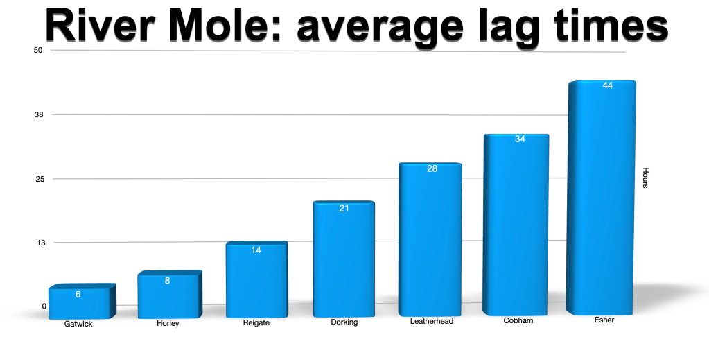 Flood control: During high rainfall events, NFMs and SuDS come into their own by storing the extra volume of runoff and attenuating flow behind leaky dams or in scrapes or similar structures. The time taken for rainfall to reach gauging stations, called the lag time, is reduced by development and land use change such as deforestation: water gets to streams quicker! Recent average lag times have been calculated for winter 2022-23 for gauging stations on the River Mole and are shown below. Notice the lag time for Horley is 8 hours compared to the 10 hours shown in the hydrograph above from 1970. This means runoff takes 2 hours less time to reach Horley than in 1970 causing more risk of flooding. This might be due to more extensive housing development during that time.