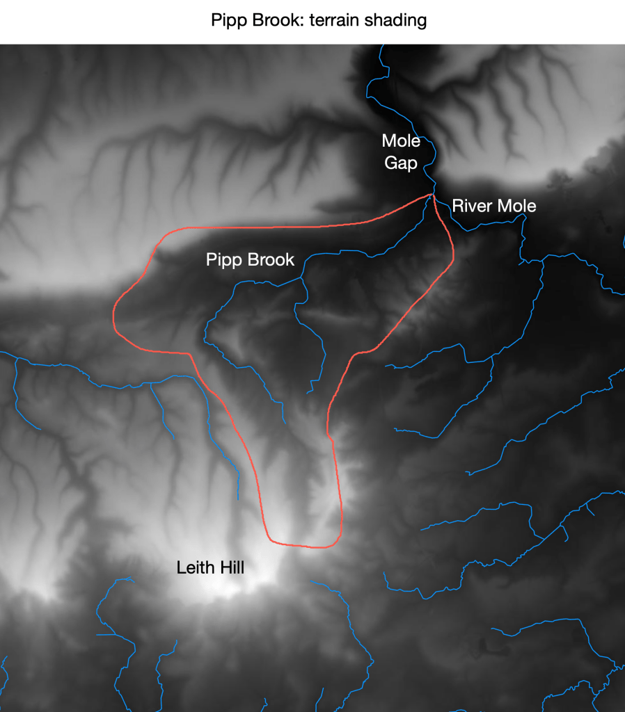 The Mole Gap shows up clearly as a dramatic cut through the Chalk Downs with attendant consequent dry valleys lying at right angles to the Mole. It’s interesting to note that the Pipp Brook is almost “through” valley, with a wind gap passing through Coldharbour marking the watershed between the Mole and Arun catchments.