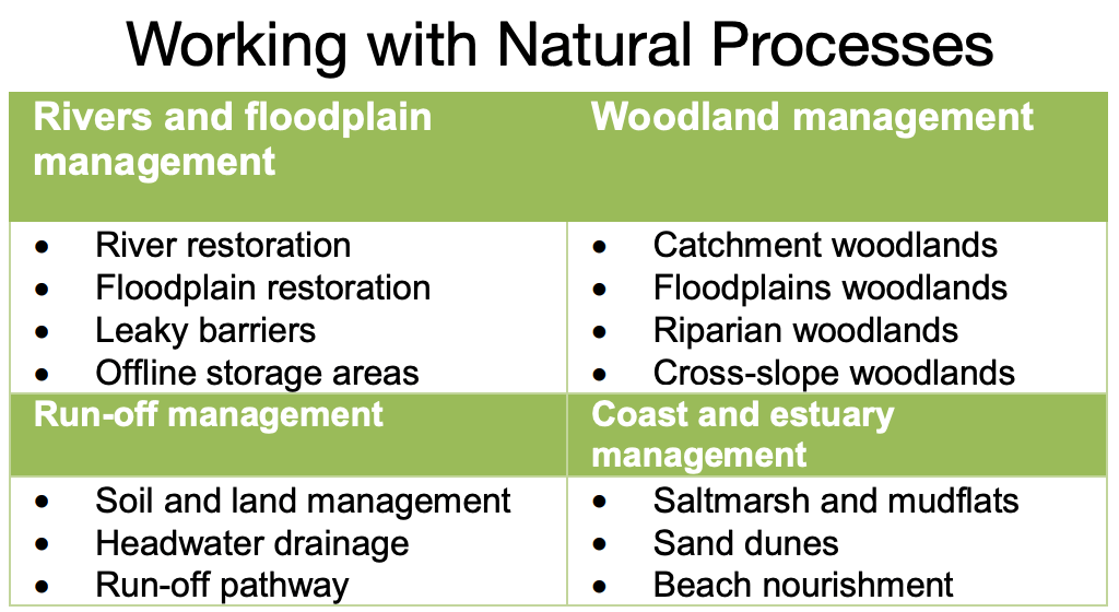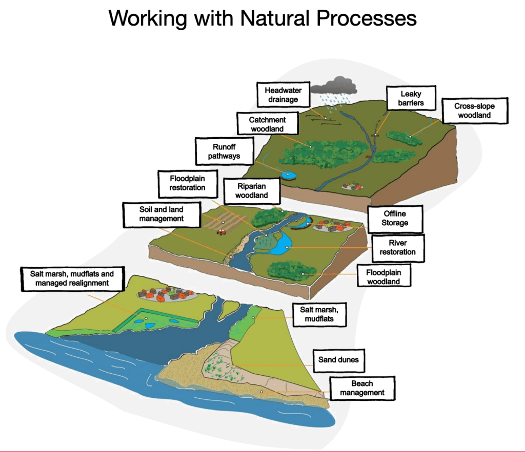 Natural Flood Management is part of a wider approach called “Working with Natural Processes”. This approach seeks to reduce flood risk and protect and restore natural functions of catchments, floodplains and rivers. The overall aim of these nature based solutions is to find more sustainable, some might also say cheaper, ways to reduce flooding by slowing runoff and storing more water in landscapes.