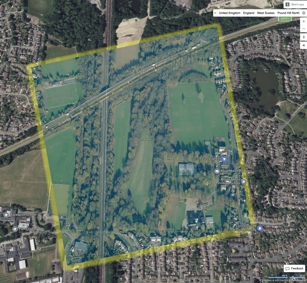 Grattons Park is a green open space sandwiched between a railway, a major road and residential development of Crawley. A series of meanders has been recreated along a short stretch of the Gatwick Stream in Crawley.