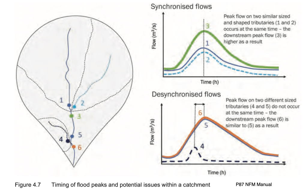 The figure below (from NFM Manual p87 Ciria 2022) the flood peak at location 3 receives flood peaks from streams 1 and 2 at the same time. Flood peaks are said to be “synchronised”. Synchronisation means flood peaks will be higher and flooding worse. There is a risk that flood peaks from NFM sub-catchments are slowed so they may synchronise with flood peaks at confluences with channels draining other parts of the catchment. This would increase the flood peak and make flooding worse downstream. This is called synchronisation and all flood management, regardless of whether it is natural or traditional hard engineering, should avoid increasing peak discharge. Local knowledge combined with hydrological expertise is required to design a desynchronised natural flood management system.