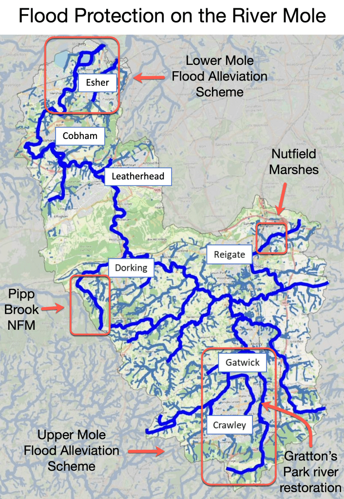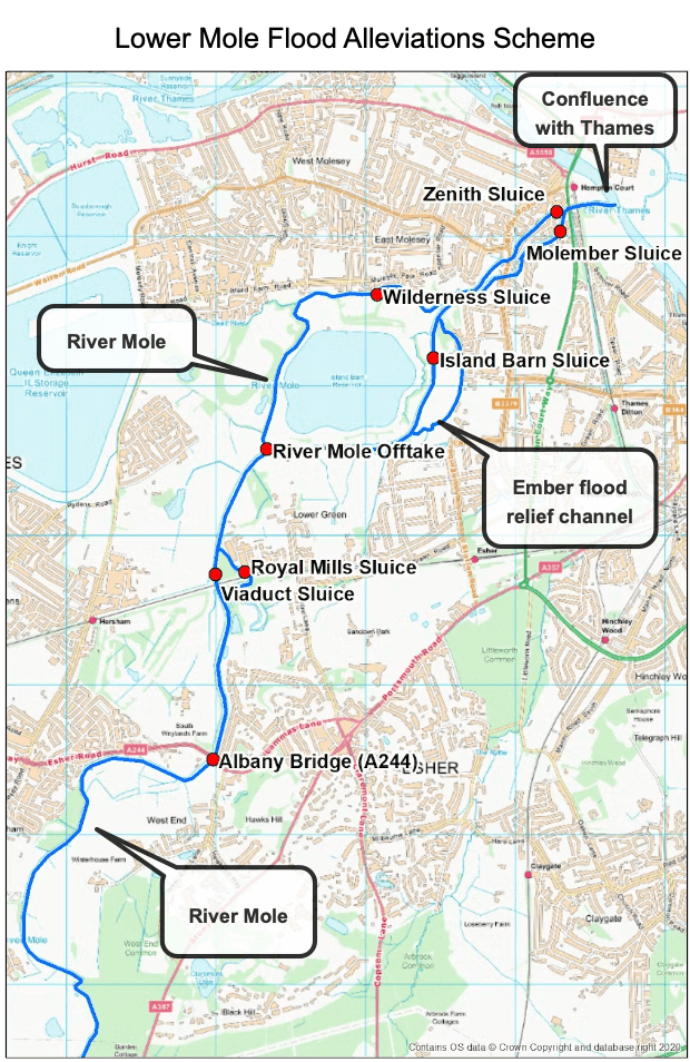The two “traditional hard engineering” flood alleviation schemes are the Upper Mole Flood Alleviation Scheme (UMFAS) and the Lower Mole Flood Alleviation Scheme (LMFAS).