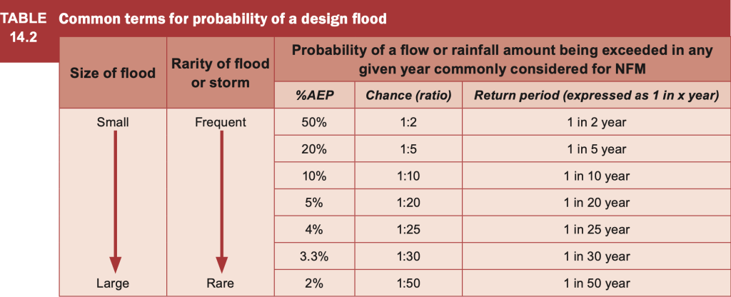 NFM measures are small-scale and typically aim to modify flows during flood events that have a 50% to 2% chance of being equalled or exceeded each year. i.e. return periods of 1 in 2 years and 1 in 50 years respectively.