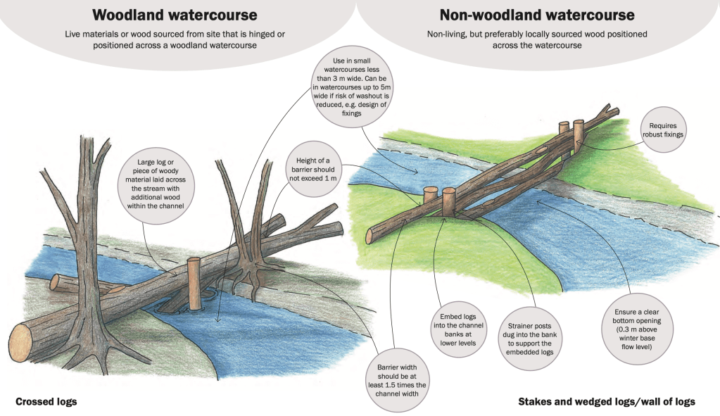 There are technical recommendations as to the best designs and locations for leaky barriers. For example, spacing barriers in series should be 7-10 channel widths downstream to encourage channel stabilisation. Furthermore, leaky log dams should extend across the entire flood plain to ensure there’s less risk of washout and erosion undermining the banks around the barrier. Avoiding locations upstream of structures like bridges and culverts reduces the risk of damage and flooding should the barriers become dislodged.