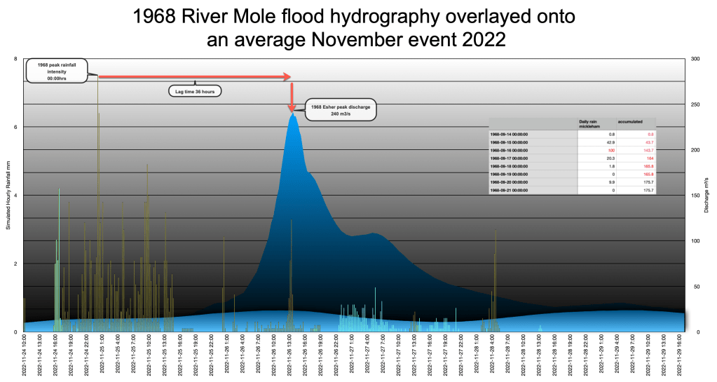 Discharge on the Lower Mole during this 1:200 year storm were over 240m³/s, a phenomenal discharge for the river, more than three times the flow of the Thames through London. Large areas of the Lower Mole were flooded as a result of more than 100mm of rain falling in 24 hours and over 160mm of rain falling over 3 days. The hydrograph below shows a reconstruction of the extraordinary 1968 discharge overlayed onto an average wet period in November 2022 when the river was frequently at bankfull flow.