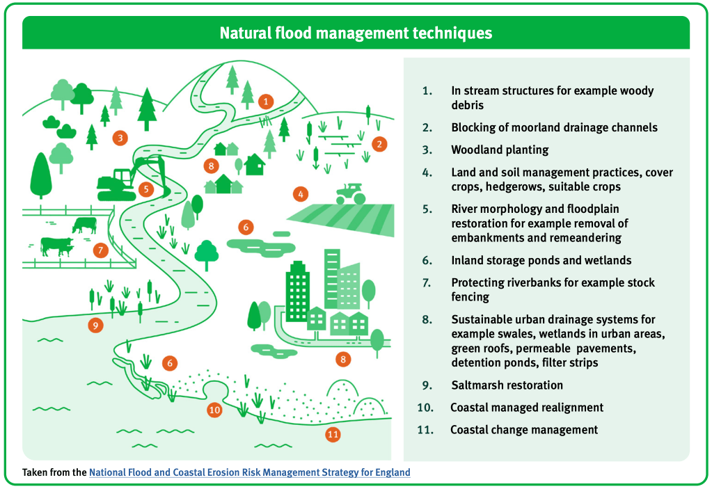 As NFMs can be cheaper than more traditional flood protection approaches, it’s not surprising that the Government is keen to promote them! Where possible, NFMs are being encouraged in preference to and/or in combination with expensive, carbon emitting, hard engineering techniques. Greater use of NFM is a feature of the government’s Flood and Coastal Erosion Risk Management: Policy Statement 2021 which states: