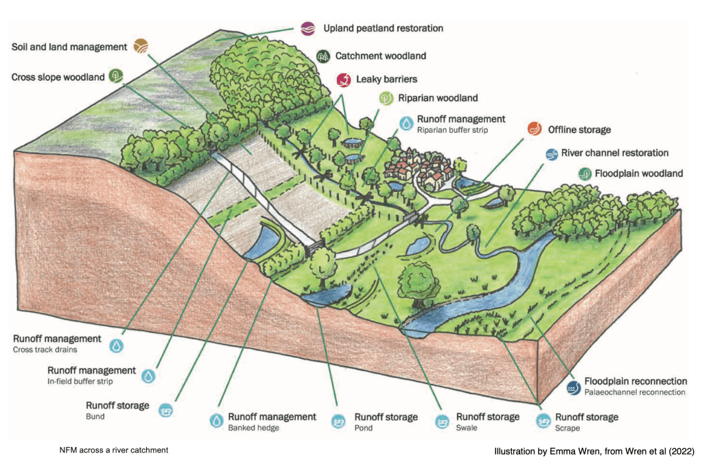 As usual, I’ve used numerous sources to research and write this. A full list of references can be found at the end. I’d like particularly to thank Emma Wren, Natural Flood Management Lead at Mott Macdonald, for the kind permission to use her beautifully drawn illustrations of the different NFM techniques published in the NFM Manual Ciria 2022. All photos are my own, unless otherwise indicated.
