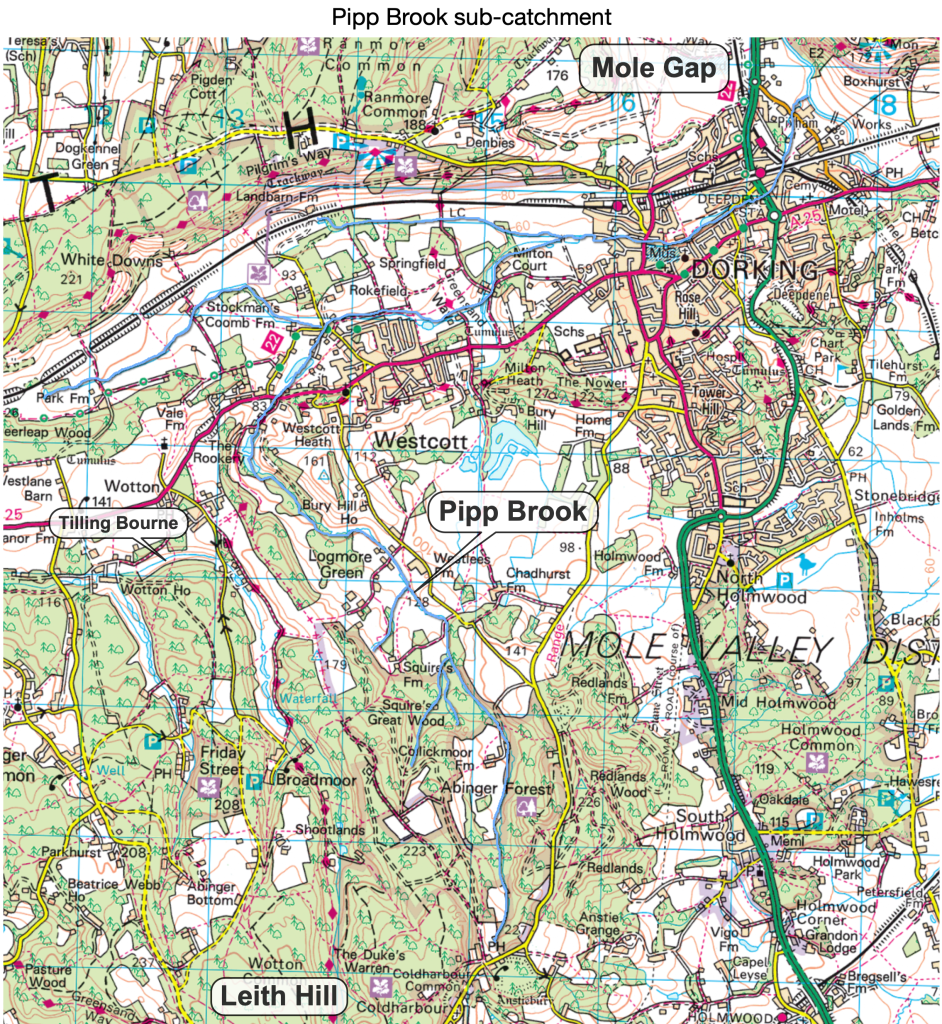 From it’s source, Pipp Brook flows north west from the Greensand Hills into the clay Vale of Holmesdale at the foot of the chalk scarp, where it turns sharply east, flowing through Dorking to join the River Mole at the mouth of the Mole Gap below Box Hill. Roughly half the catchment is rural, forests and farmland, while the lower course of Pipp Brook is urban, flowing through Dorking and its suburbs.
