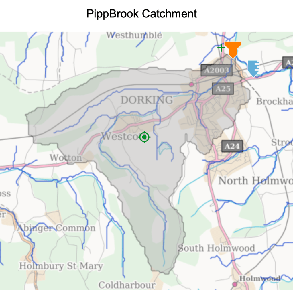 The confluence of Pipp Brook with the Mole at Dorking lies at 37m, so the Pipp Brook has one of the steepest descents of any streams in the catchment of 168m over 8.7km. It is an ideal location for a Natural Flood Management Scheme.