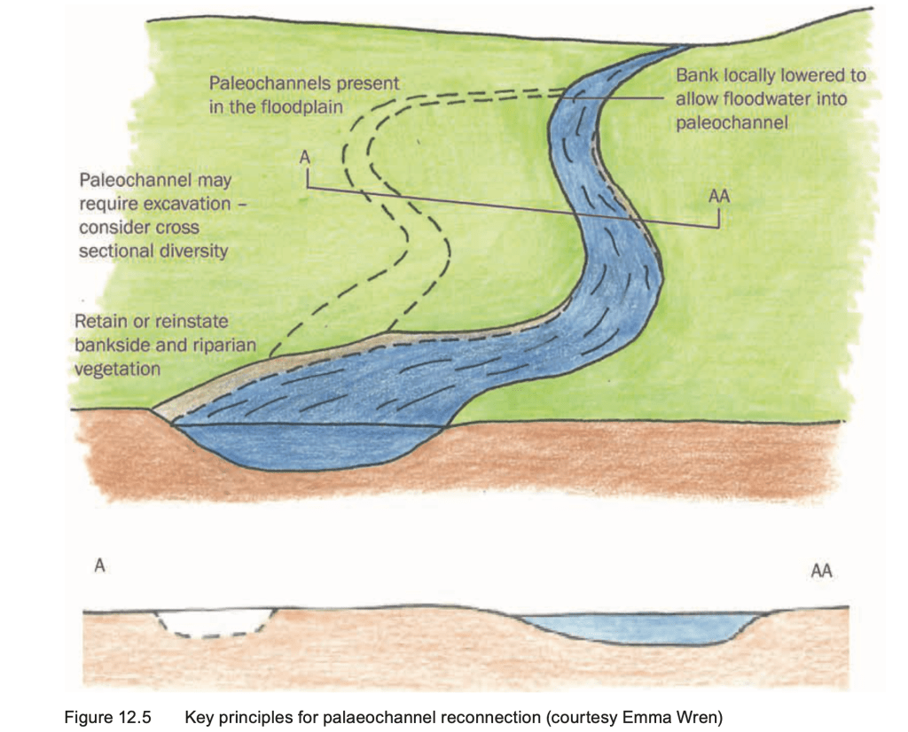 Reconnecting the river to former courses, called “paleao-channels” or engineering new ones creates channels, washlands and wet lands that will store water and reduce flooding downstream.