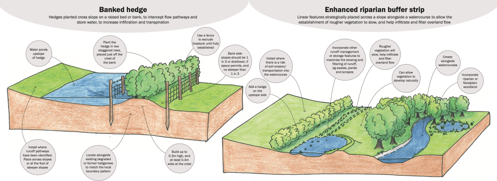 - Cross-slope hedges and trees: native hedgerows of at least 1.5m width provide great biodiversity and wildlife corridors. They increase interception and infiltration and take up water. Hedges can reduce spread of disease to livestock by reducing animal contact. Hedges also improve water quality and capture and store carbon.