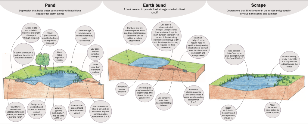 Small temporarily filled ponds called scrapes are designed to attenuate or delay flood peaks until the peak volume has passed. They are engineered bowl shaped depressions trapped by a bund or excavated into the contour of a slope. They usually have an inlet from the river channel such as a leaky barrier or flow control structure that allows water to flow into the pond at peak levels and infiltrate naturally into the ground or drain out slowly as levels subside.