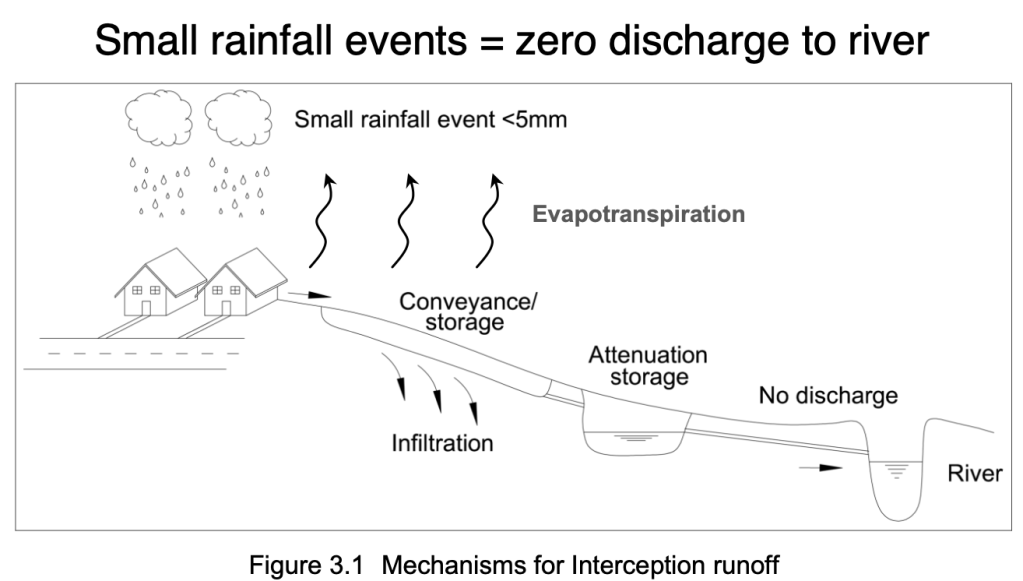 For example, low intensity rainfall events of less than 5mm account for 50% of rainfall in UK catchments. Light rain usually contributes no measurable runoff at all in a natural catchment area because the rain is intercepted by vegetation, infiltrates into healthy soils or evaporates before reaching water courses. Infiltration augments soil water storage and increases the resilience of the catchment to drought.