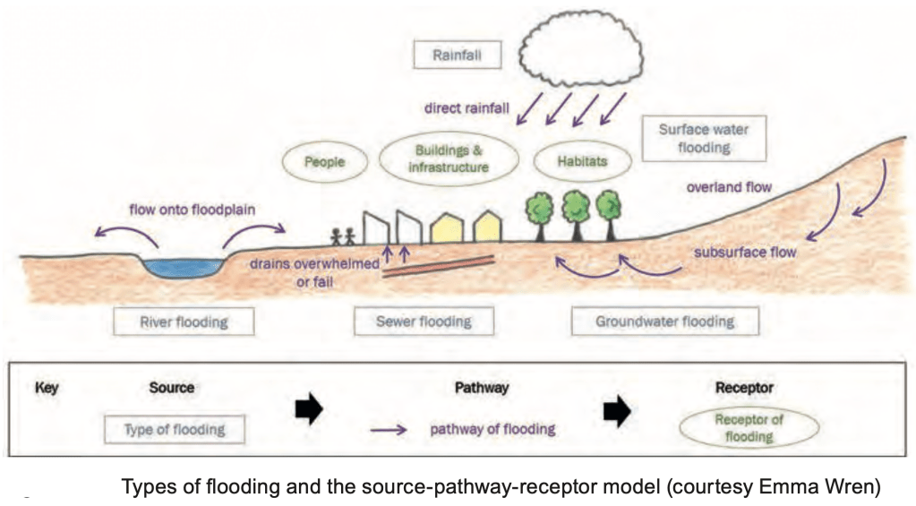 There is considerable overlap between Sustainable Urban Drainage Schemes (SuDS) and NFMs. They both seek to slow the flow. Sarah Bentley, Thames Water CEO, called SuDS methods “spongifying” the urban environment by employing techniques such as planters and rainwater butts, permeable pavements, ponds, swales and scrapes. The aim of SuDS is to minimise surface runoff and store the additional volume of discharge running off new developments.