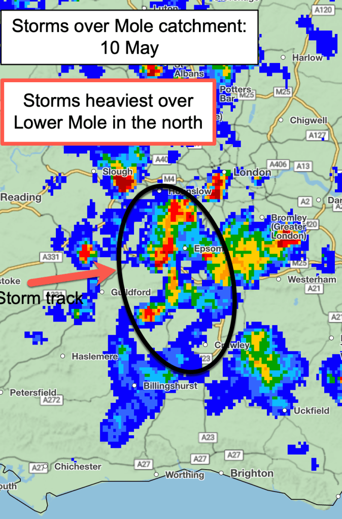 In particular, both the 9 May and 11 May saw storms mainly dropping rain over the south of the catchment, the Upper Mole, while 10 May saw most heavy rain fall further north over the Lower Mole part of the catchment. The changing configuration of these showers turned out to be useful in showing how the whole catchment responds to rainfall and which part most controls discharge.