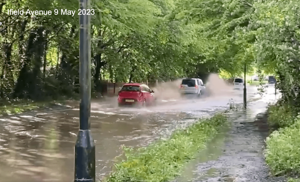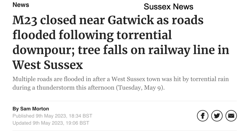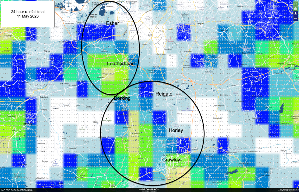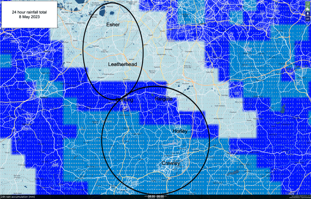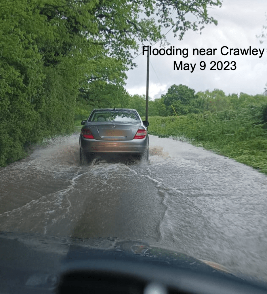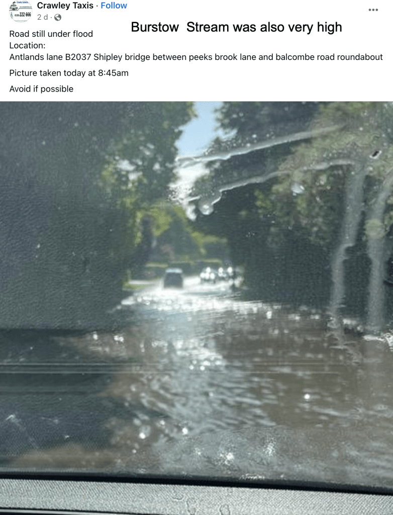 Regardless of the accuracy of the Rusper record, the widespread heavy rain across Crawley caused the Upper Mole and surrounding tributaries to rise quickly and cause local flooding. Social media posts showed floods widely across a broad swathe of the town, especially in Ifield and Pound Hill as well as on the Burstow Stream at Shipley Bridge and near Rusper.