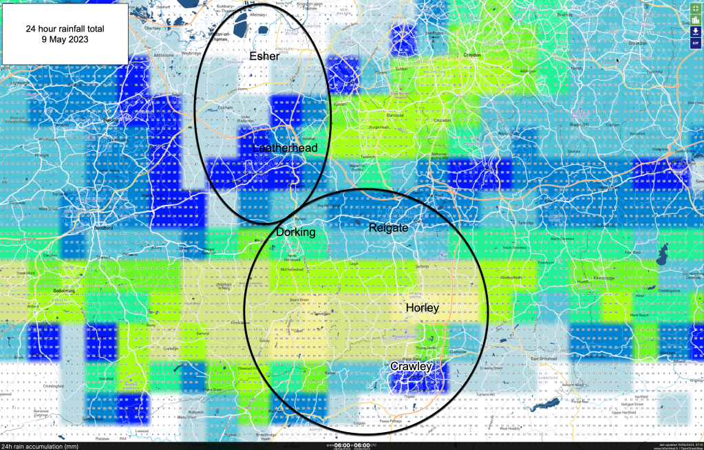 The evening of 8 May saw rainfall up to 10mm widely across the Upper Mole. Peak rainfall intensity occurred around midnight and the river at Gatwick responded rising to reach a peak discharge of 2m³/s at 06:15 on 9 May, a 7 hour lag time. This peak proceeded downstream and registered at Dorking 8 hours later. By that time, however, large thunderstorms were building up further upstream.