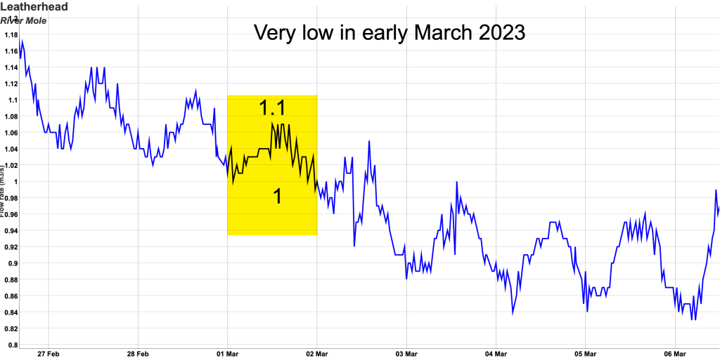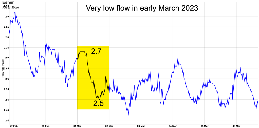 During low flow conditions, more water arrives in the Lower Mole from sources other than rainfall runoff, which has effectively “dried up”. This suggests the contribution of the Upper Mole to the total flow is considerably less during dry spells. February 2023, for example, was an exceptionally dry month. The charts below show discharge at Leatherhead and Esher dropping so low that levels started to show the daily rhythms of sewage effluent discharge augmenting natural flow. The ups and downs occur after the population’s morning “wash and flush”. The range between the daily high and low effluent “tides” is particularly noticeable at Esher in the Lower Mole. Presumably this is because a greater population density and larger sewage works means the contribution to discharge is greater.