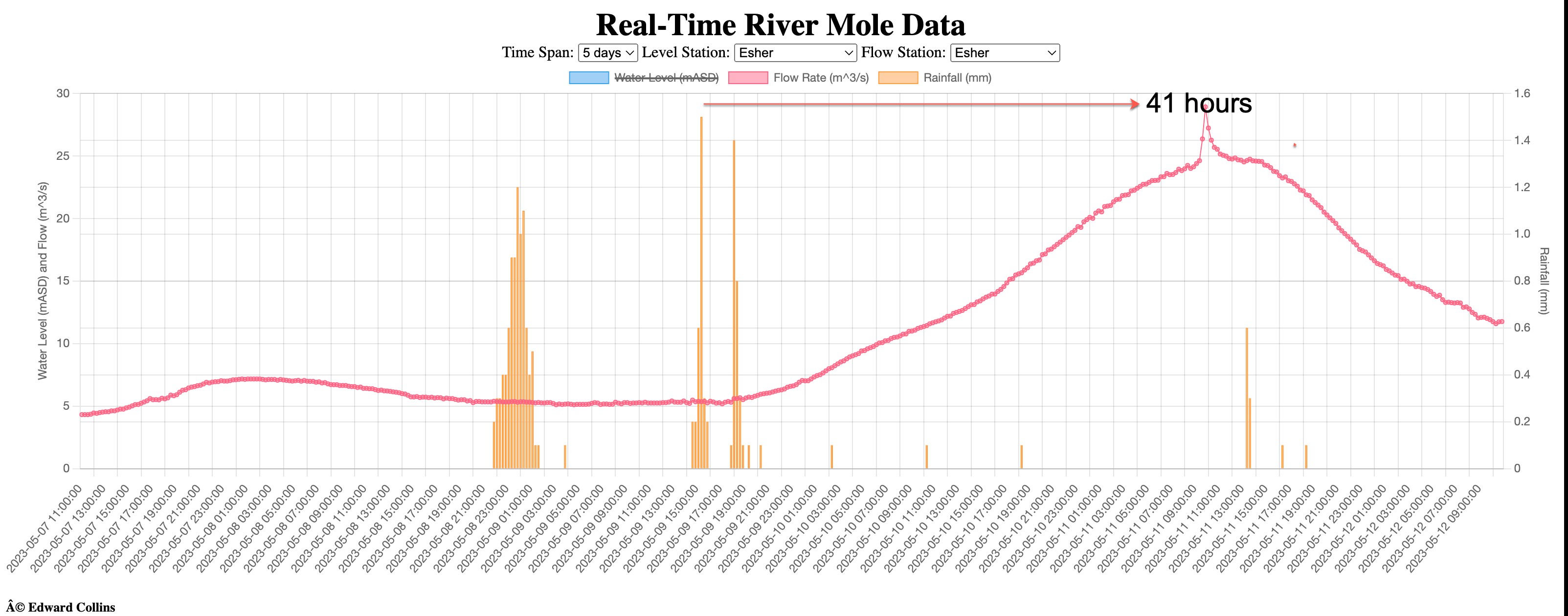 For example, in the chart above, the slight rise indicated at Esher around 40 hours after the rain occurred in the Upper Mole shows how the Lower Mole is essentially the recipient of discharge from upstream, homegrown discharge from the Lower Mole is less significant in the total volumes represented in most normal conditions.
