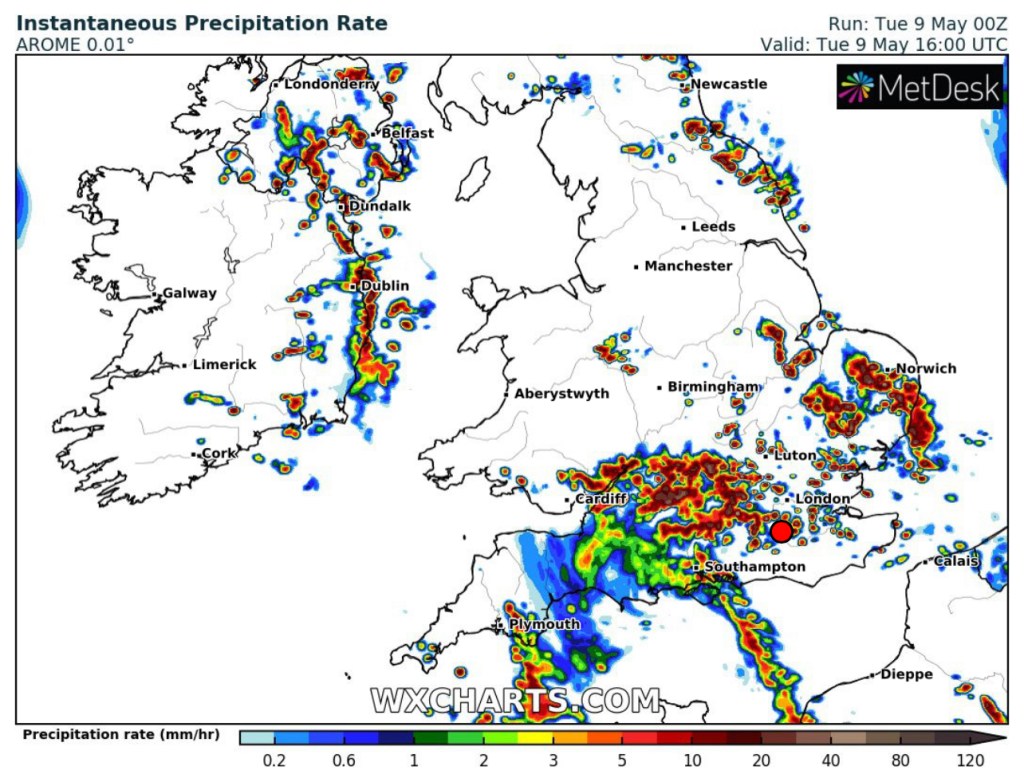 As is usual for convective stormy episodes forecast models struggled to pin down how much rain would fall even up to the day before. Predictions of total rain accumulation for 9 May ranged from 0.4mm to over 19.8mm. It turned out the upper end proved to be an underestimate for anywhere caught under the thunderstorm on 9 May.