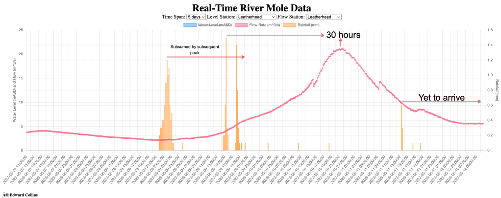 This is partly because the huge rising limb from the 9 May storms in the Upper Mole was arriving in the Lower Mole through the day on 10 May. Due to the nature of the Mole catchment, rainfall over the Lower Mole area has less impact on the river than what goes on in the Upper Mole. I’ll explain why below.