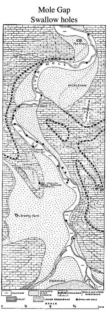 A further uncertainty hampering a full picture of the provenance of river discharge includes the loss of flow into chalk swallow holes in the Mole Gap. There are figures suggesting a proportion of discharge is lost to groundwater through the Mole Gap especially (or entirely?) during periods of low water table. However, while some flow disappears into swallow holes, much is known to resurge back into the river through springs around Leatherhead. So the overall impact of swallow holes on total discharge is likely to be quite small, it seems to be a temporary plumbing issue restricted to the Mole Gap rather than a permanent abstraction of discharge from the river. This is an area which needs more research as the internal plumbing of the Chalk north of Dorking through the Mole Gap remains an intriguing local mystery! Any leads or refs welcome.