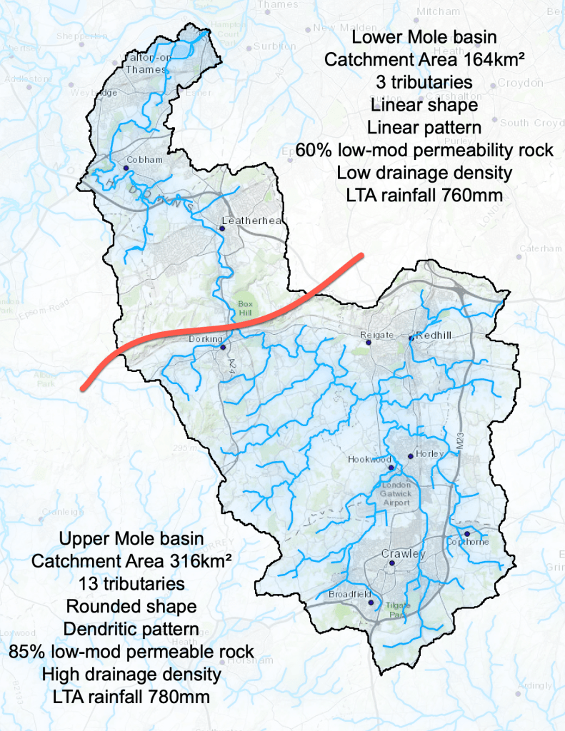Shape! The Mole catchment is a skewed pear shape with a “fat” Upper Mole basin compared to a skinny Lower Mole basin. The fat Upper Mole south of the Mole Gap covers 316km2 while the Lower Mole (north of the Mole Gap) covers 164km2.