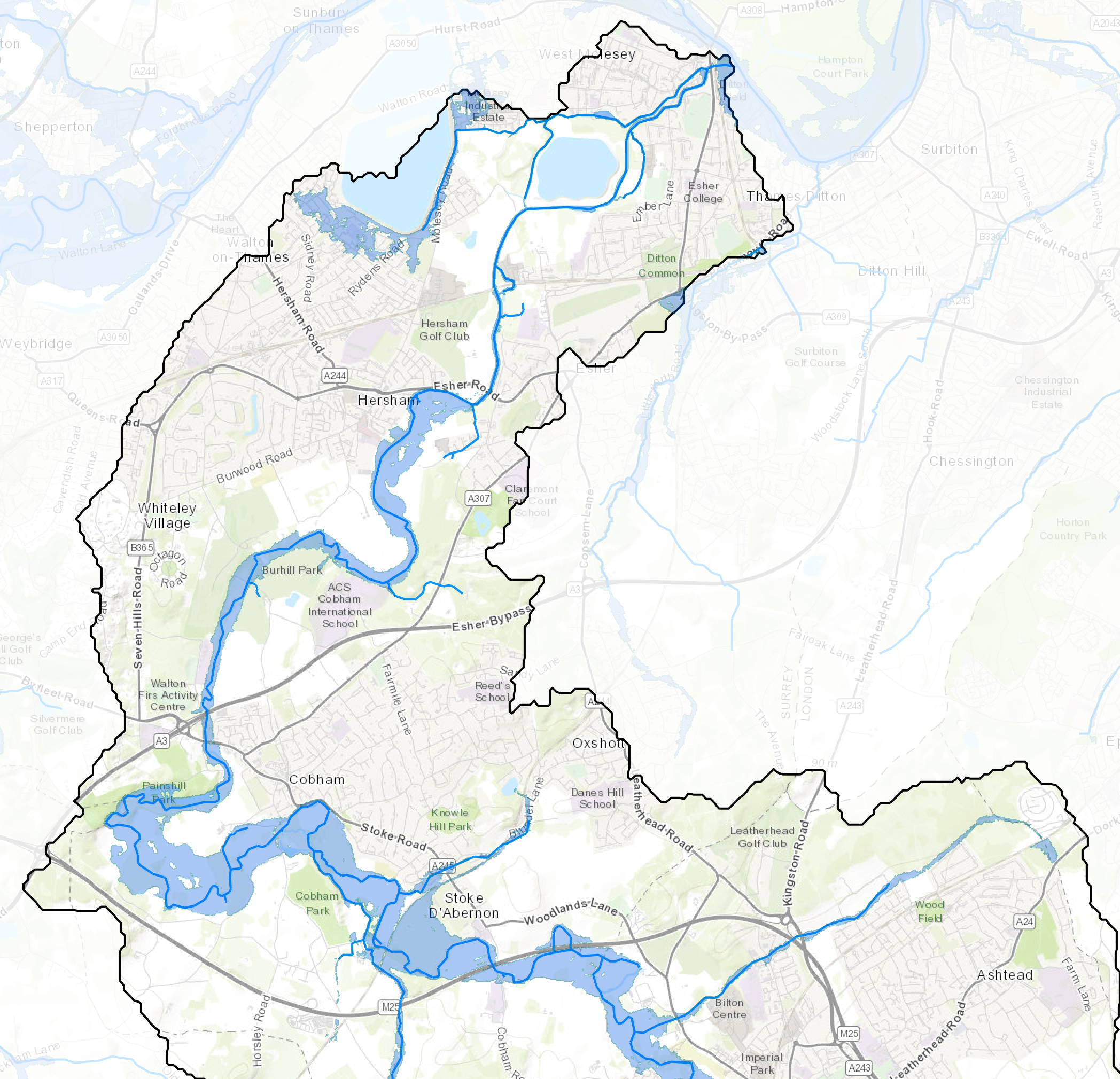 The Ember works as a flood storage reservoir which, if prepared by lowering beforehand, can accommodate flood peaks arriving from upstream so that it does not spill onto the flood plain. This has worked effectively to control frequent high probability flooding (Flood Zone 3) of up to around a 1:100 year return period in the area since the 1980’s when it was built. A low probability higher impact event, say 1:200 year or more, might still cause flooding as shown on the flood maps above.