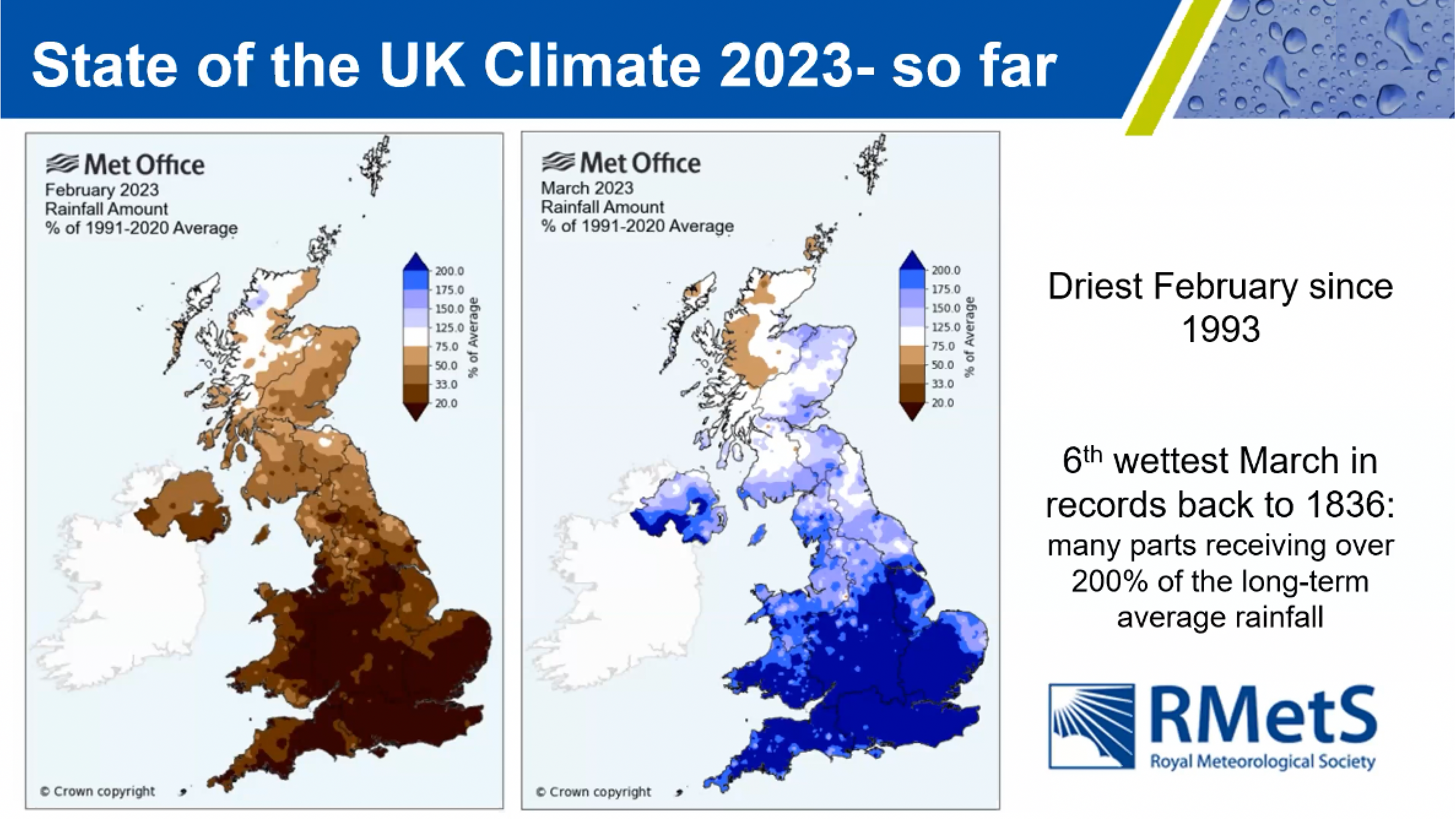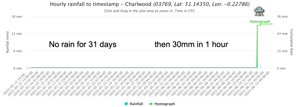 During the 31 day dry spell no rain fell at all and river levels in the Upper Mole catchment fell to well below typical range. Prolonged spells of dry weather spaced with heavy thundery downpours are recognised to be a characteristic feature of climate change.