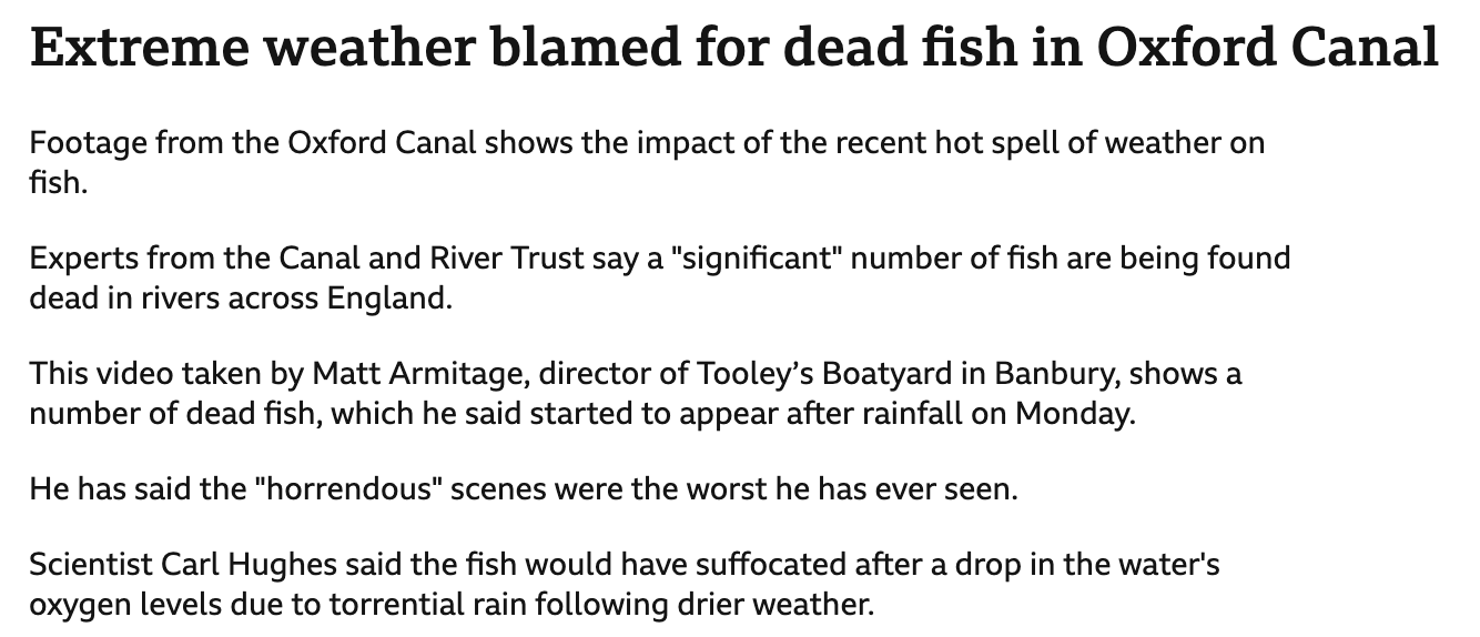 Oxford https://www.bbc.co.uk/news/uk-england-oxfordshire-65906123 : He has been working on the water for more than 30 years and said the “horrendous” scenes were the “worst ever seen”. Extreme weather blamed for fish deaths https://www.bbc.co.uk/news/av/uk-england-oxfordshire-65909711