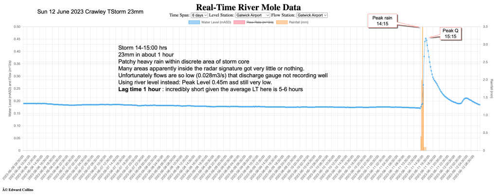 The Mole received heavy and, in places, torrential rain in the thunderstorm over parts of north Crawley, Hookwood, Charlwood and Horley. In some places the storm dropped up to 30mm of rain in a few hours. In a few locations up to 20mm in one hour was recorded. It was by no means an extreme weather event, but rather a typical heavy summer thunderstorm with a return period of around 5 or 6 years.